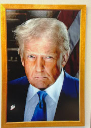 Trump Police Mug Shot which is posted in the entrance to the Oval Office in the White House