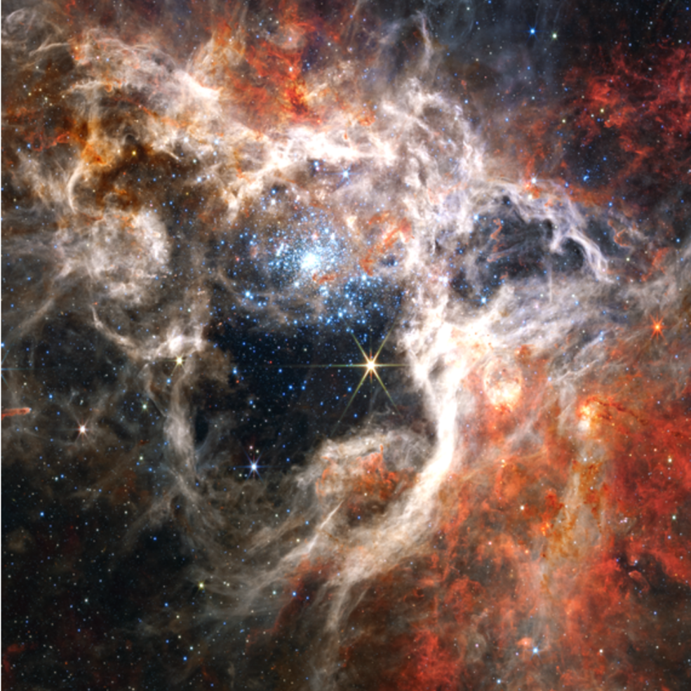 The Tarantula Nebula, some 340 light years across, as recently photographed by the James Webb Space Telescope. It is 161,000 light years away, located inside the Large Magellanic Cloud (a satelite galaxy of the Milky Way). The pale blue stars in the center are massive, young stars never seen before.