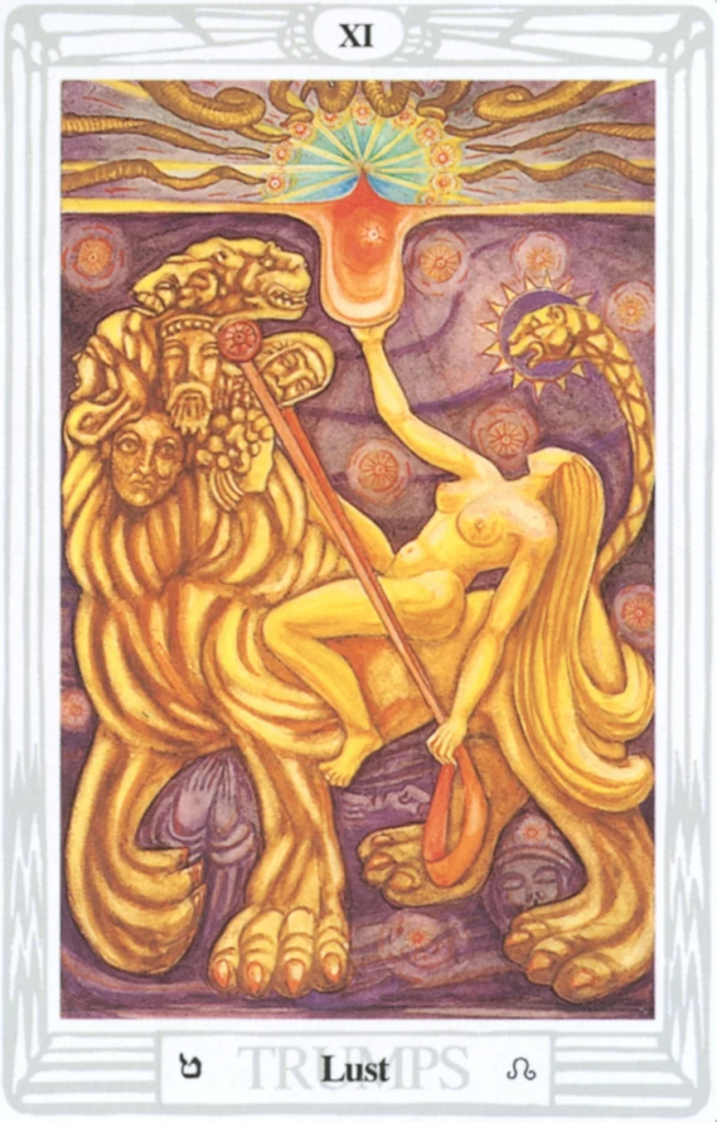 Lust (or Strength, Fortitude, Lust for Life) is numbered eleven and is a card of spontaneity and enthusiasm. This is the card which gives us the strength and nourishment we need to get through.We usually see a young innocent girl opening the jaws of a lion and peering in. She must be reasonably certain she can cope with the results of her actions! There is no sense of competition between the two. Here we see the literal meaning of the card – walking straight into the jaws of danger and relying upon our own experiences and quick-wittedness to see us through.Lust tells us to joyously accept life – to trust ourselves to make the right choices and to be able to deal with whatever happens. With trust and self-belief we can grow and work towards happiness and fulfilment.