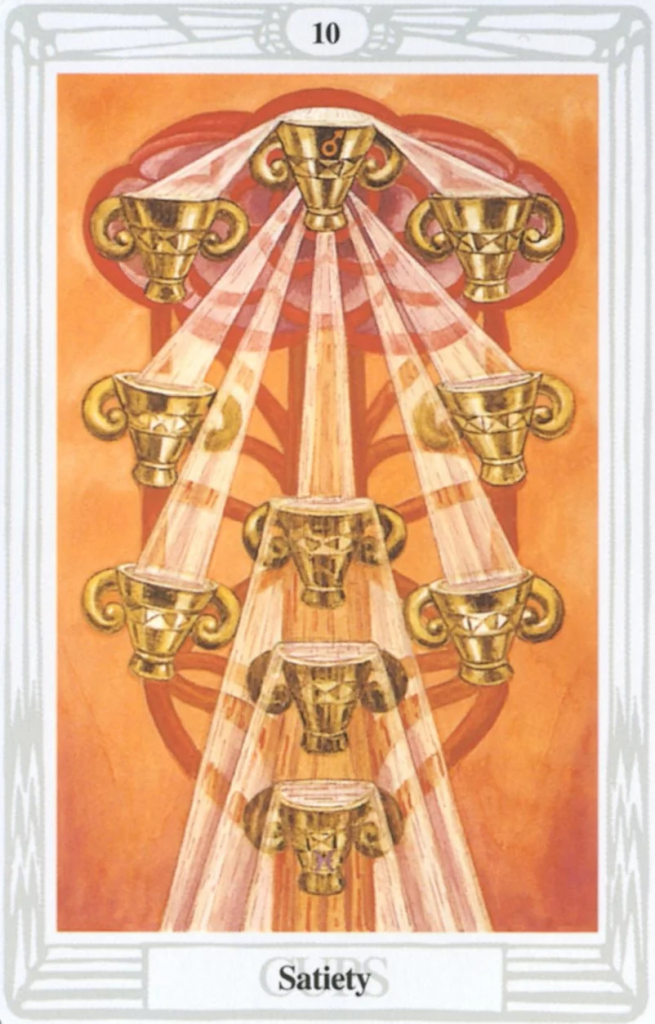 | The Ten of Cups The Lord of Satiety is a sanctuary card… it indicates a blissful moment in time where we feel contented, happy and emotionally satisfied. It’s easy to be at one with the Universe when you feel this blessed. We are more readily able to make contact with the High Powers, and to experience their energies in our lives.So on a day ruled by the Ten of Cups, be aware that you are probably walking closer to the Gods (however you conceive them) than on most more ordinary days. Expect intuition to be heightened, and make sure you give yourself the time to listen to it.Try to make an oasis of silence around yourself every now and again, so that you can simply experience and feel and know the quality of your life. This doesn’t have to be for long periods – five minutes here and there throughout the day will make for a happy interlude.Remember – when you feel loved yourself, you radiate love to others. You don’t have to do anything more complicated than allow yourself to be satisfied. Days like this are rare enough. But when they come around, if you let the brightness inside your soul, it lights you up from the inside. We gather strength on these days – strength that carries us forward through the challenges and storms that inevitably touch our lives from time to time.Strive to be peaceful and secure in your home environment too. And don’t let yourself be impatient for the things that have not found their right moment in your life yet. Absorb, grow, rest and replenish… these are the important things to do on a day ruled by the Lord of Satiety. Affirmation: “Today my life gives me everything I need to be happy.” |