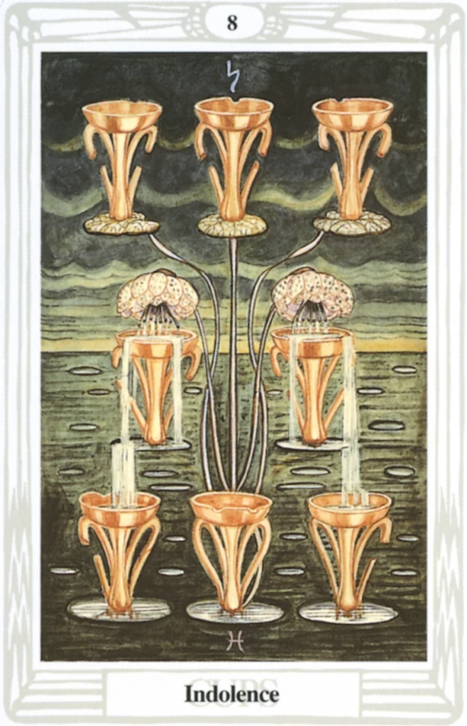 | The Eight of Cups The Lord of Indolence arises when energy is blocked, and where it is beginning to stagnate. This is, obviously, a nasty and potentially dangerous situation which must be addressed if it is to be cleared out of the way. You may, though, feel tired and apathetic about challenging issues which seem too big or too stubborn to deal with.If you are currently feeling quite trapped by life, then today is a day where you can make a profound difference to the way things around you are affecting you. Target one area which is taking more energy from you than it gives back. Think through your reactions and responses to this situation. Consider whether you’re tending to slide a bit toward feeling like a victim – don’t judge this, just consider it. If you judge something that sensitive, you will become defensive, and therefore be unable to tackle the problem properly.If you, after analysis, decide that you are contributing to the difficulty, then you have it in your power to simply refuse to worsen it with a negative attitude. Tackle the affirmation with great gusto! That should shift your own blockages.If, on reflection, you feel that the problem is not yours, but somebody else’s, the first thing you need to do is refuse to react by giving more energy. Just stop. For this day, refuse to play the game. And do the affirmation! That should cause some shift, if only in your own approach.Finally, if you feel you do not have any major problems today, then consider the whole energy exchange that is the sum total of your life. Assess things realistically. Ensure that there are no areas of leakage. If there are, then consider what you can do. If there aren’t, congratulate yourself for living your life in accordance with the dance of the Universe!! Affirmation: “My energy is the energy of the Universe. My power is my own.” |