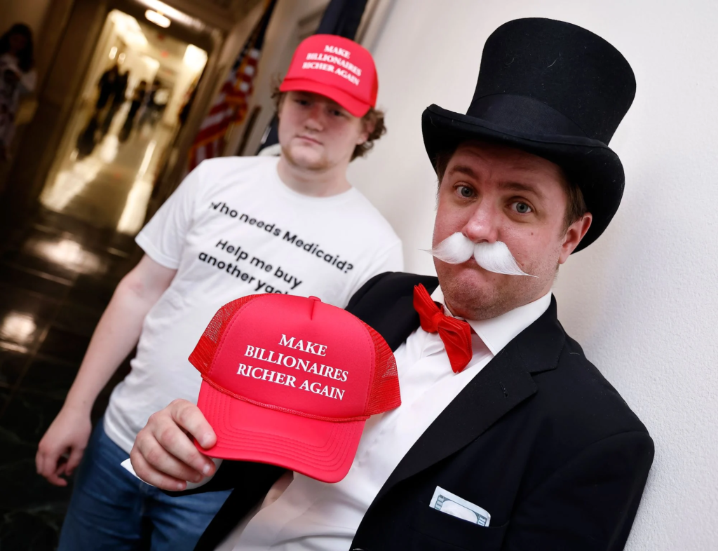 Image: WASHINGTON, DC – MAY 13: Advocates pose as Monopoly men and wealthy DOGE supporters while protesting tax breaks for billionaires and the Republican tax plan, inside and outside the Ways & Means Full Committee Markup to advance the legislation in the Longworth House Office Building on May 13, 2025 in Washington, DC. (Photo by Paul Morigi/Getty Images for Stop Billionaires Tax Cuts Campaign)