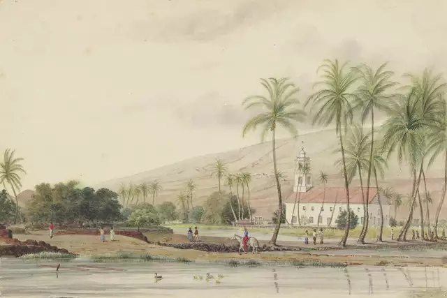 An 1855 watercolor by James Sawkins portrays Mokuula Island surrounded by a fishpond in Lahaina.James Gay Sawkins