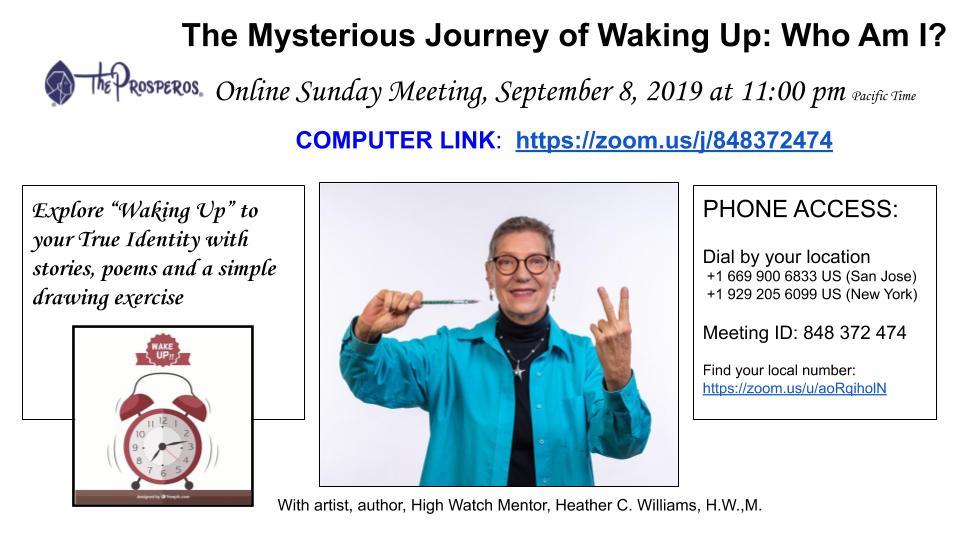 You are invited to take a break from your busy week-end and join me for a one hour talk exploring how the crazy, tumultuous world around us is guiding us ever closer to our True Identity as Consciousness. You are the ability to create and govern thought! Come to my next PROSPEROS SUNDAY MEETING! Sunday, September 8, 2019 at 11:00 am PST.