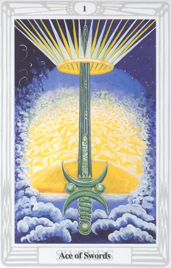 | The Ace of Swords As a Suit, Swords are about thought, communication, and, sadly, often also about conflict and emotional turmoil. People often become confused about why that should be – this Suit contains more ‘bad’ cards than any of the others. But when you consider that one thing which inevitably happens when we are hurt and unhappy is that objectivity and clarity go out of the window, you might be able to understand why so many harsh cards turn up here.Aces are always about the beginning of something – usually related to the Suit they are from. From that you can see that the Ace of Swords is about the ability to see things from a clear perspective. When this card rules, we are able to cut away the rubbish and confusion which tends to cloud out major issues. We can see what is important and worth fighting for. And we can also identify the red herrings that keep us from seeing clearly.We become more able to make good decisions, more ready to see other points of view, more clear about what we really think about things. When this happens we often choose totally new directions for ourselves, reaching a point where we can transform and empower our experiences.So when this card comes up in a reading, or to rule a day, then it means that we need to step back, and think rationally about everything which crosses our path. We need to cut away rubbish and clutter, so we can see the inner truth we seek.There is a decisive and powerful energy which flows from this card, and engaging with it will allow us to understand ourselves, and others more thoroughly than before.In a spiritual sense the appearance of the Ace of Swords will often mark a turning point or breakthrough into new clarity and wisdom |