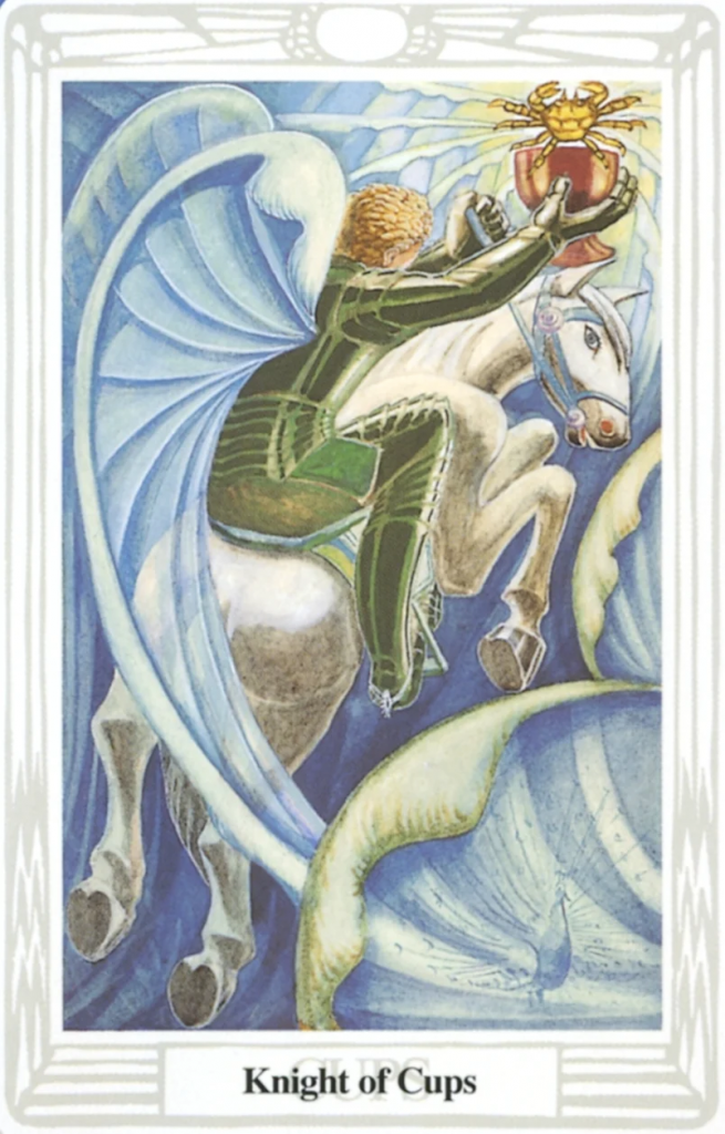 | The Knight of Cups This is the Lord of Waves and Water, often defined as the fiery aspect of water. As such, in many ways this card represents a contradiction. Most often when it appears, it will indicate an actual person who has influence. However sometimes it can also indicate a moodshift or a change of mode.Since the Suit of Cups is all about love and loving relationships, it’s easy to see how the Knight can be regarded as the lover of the cards. When representing a moodshift, the card can indicate the period where a man falls in love.When it represents a person he will be a complex and highly emotional being – creative and visionary, sensitive (and sometimes over-sensitive), romantic and intense. He will give the impression of being open and caring, though this is often misleading; the Knight of Cups is often subject to intense insecurity, needing constant re-assurance and attention.He is attracted and attractive to women, and enjoys basking in their company. He will often be very charming, with a silver tongue and a powerful personal agenda. He will rarely manage practical matters well, tending to place rather more importance on buying two dozen red roses, than paying the bills. At his worst, he can be inconstant, unfaithful and selfish.At his best, he is loving, generous with his emotions, supportive and tender. He can be capable of high levels of spiritual development, strong in intuition and warmly responsive. When he’s on form he is terrific company, having a good sense of humour and a keen interest in other people. He’s often an exciting and stimulating life partner and lover – but only at his best!You see – I said he was contradictory! |
