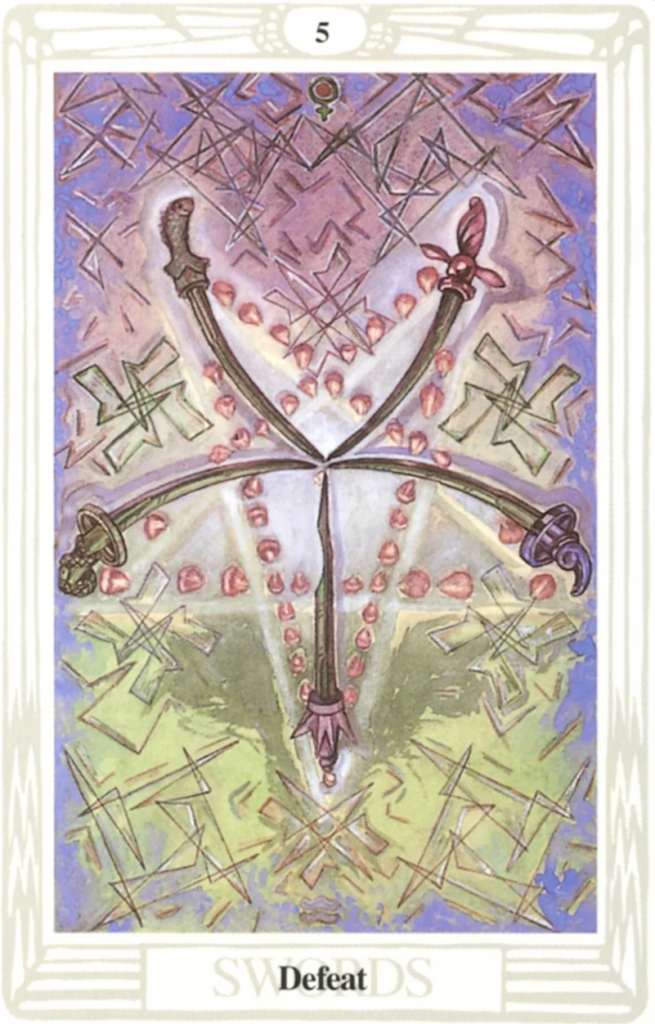 | The Five of Swords The Lord of Defeat is yet another of the unwelcome Sword cards. It generally appears to indicate that we are in for some disappointment or loss.In a highly competitive world, we are bound to be defeated by some of the challenges we set ourselves. If we are not to limit ourselves so severely that we never compete for anything, then at some time this card will inevitably come up. And our response to its effect is very important. If we feel shattered and disillusioned, then we will start the process which leads inevitably to the Ten of Swords – Ruin.The way we face the Five of Swords has a great deal to do with how much effect a setback can have on the whole of our life. If we are able to accept that we cannot be winners all the time, if we are to set our minds to learning from our experiences, if we are to struggle to be positive in the face of adversity, then we can overcome disappointment, and rob the Lord of Defeat of total triumph!In occasional really bad cases the card can indicate external treachery – somebody deliberately attempting to undermine or damage us. In this case it will almost always come up with other Swords like the Nine of Swords, or the Eight of Swords. If the Ten of Swords appears further on in the reading, then we are in danger of being affected quite dramatically. In this case you would need to consider who you think your enemies are, and take appropriate steps to combat their illwill – never underestimate the power of other people’s malice. And don’t retaliate with more of the same!At most times the Five of Swords will indicate much smaller matters than this – you won’t get the job you applied for; you won’t sell the manuscript this time; you won’t get the exam result you wanted; you won’t get the house you tried to buy. Look for surrounding cards that indicate the area of your life which will be affected.It’s natural to feel down-hearted when we don’t get what we want. But it’s rare that every single thing in a person’s life is going badly at the same time. So count your blessings, pick yourself up and go and do something nice for yourself. And remind yourself of something – you tried, and can try again. And maybe next time your efforts will be met by the Lord of Success!! |