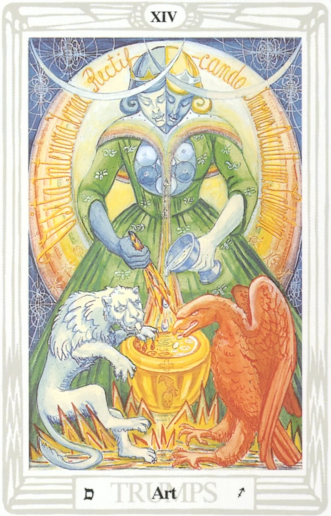Art (or Temperance) is numbered fourteen and usually shows the figure of a young woman or angelic being, who is pouring water from one vessel into another. Not a single drop is spilt. This card is related to the union and harmonisation of opposites.