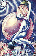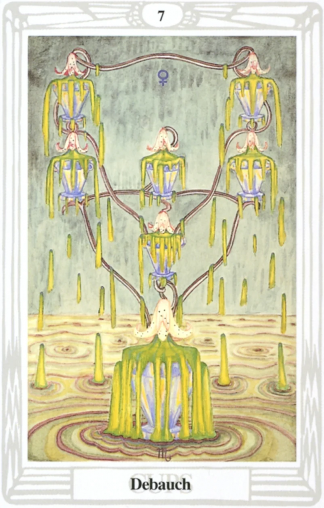 | The Seven of Cups The Lord of Debauch is one of those warning cards that we must always take seriously when we come under his influence. Without fail, when he appears we must expect to be subjected to some kind of temptation or test. We must be on our guard for making the exact mistake that he tells us is possible.Temptations come in many shapes and forms, don’t they? Some of these are minor, and others much more serious. The Seven of Cups deals primarily with sensual pleasures… sex, food, money, status.Sometimes, the card indicates that we are surrounded by a multitude of different pleasures, and cannot quite make our minds up which ones to choose, out of the many available to us. In so doing, we miss the boat altogether and end up with nothing. Or, alternatively, we greedily snatch at everything we see, possibly missing the real treasure that is waiting for us to notice it.Greed, triviality, surrender of moral ethics are the big problems when this card appears. We must guard firmly against any of these things, holding hard to our sense of love and goodness.On a day ruled by this card, you need to keep a sharp eye open for all of the above. Also try to monitor your reactions and responses to others – another way we can give in to the Lord of Debauch is to treat another human being in a way we wouldn’t wish to be treated ourselves.If your irritability quotient goes up, spend some time with yourself working out why, and then deal with it. That way you won’t snap the heads off the people you love. If you feel impatient and frustrated, again, work out why… then go and satisfy yourself.On the high spiritual level, this is a day where forgetting what you believe in will accrue some debt unnecessarily. Be alert for tests of your belief, strong in your love, and bright in your life. That way you should pass the test!! Affirmation: “I am strong in love and bright in life. I shine with the radiance of a star.” |