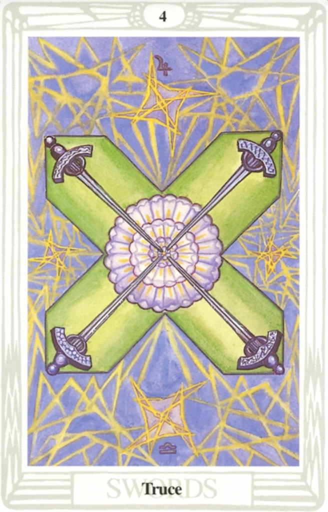 When the Lord of Truce appears he brings with him a temporary respite, often after we have passed through trying times. This is a quiet period, which should be used to recover, regroup and stabilise. It’s important though, that we always bear in mind the fact that this is only a moment in time. Soon we shall be required to pick up the tools of life and continue on our journey.So on a day ruled by him, we’re well advised to use the internal stillness he brings to think over trouble spots, or areas of difficulty. That way we see the whole issue more clearly, and are better equipped to sally forth undaunted when the time comes.Occasionally on a day ruled by the Four of Swords there will be a requirement to bury the hatchet with somebody, or to accept their gestures of friendliness toward us. It’s important that we are reserved both in what we are prepared to offer, and what we are prepared to forgive. Truce only marks the cessation of hostilities – a brief pause during which we might negotiate a lasting peace.The one thing this card always tells us is that we have not yet finished our business here. If we fail to hold this in the forefront of our minds, we are likely to make the mistake of being unprepared for whatever comes next.So – on this day – rest as easy as you can, and locate areas of challenge, difficulty or sensitivity for future attention. Think carefully about trying to resolve anything until the influences are more supportive.