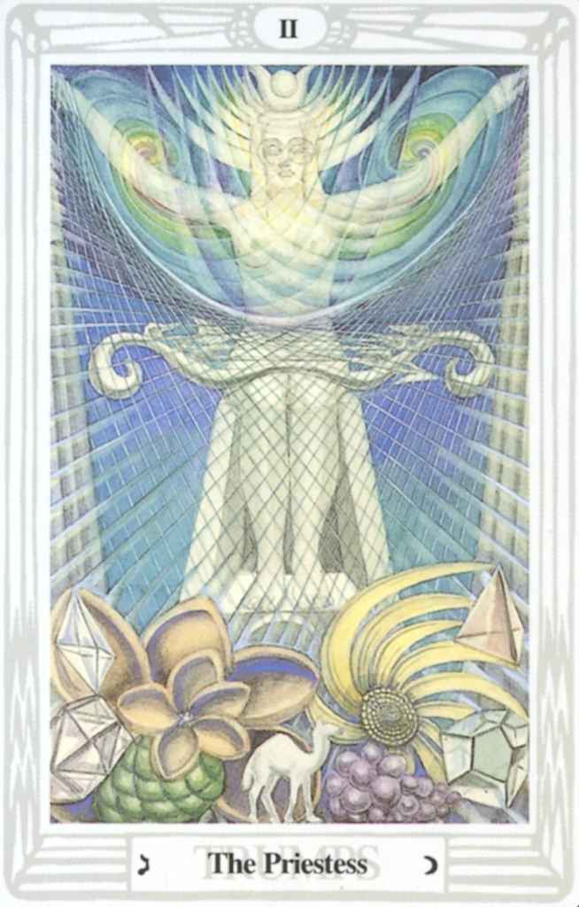 | The Priestess The Priestess (or High Priestess, Papess, Pope Joan, Isis) is numbered two. This is the representation of the Goddess. She is the complementary partner of the Magician, possessing all his skill and ability, but with far more insight and psychism. She is more subtle yet somehow far more noticeable.She is almost always shown with the Lunar Crescent, conveying her natural affinity with the forces of Nature and natural cycles. The Magician generates his own power, whereas the Priestess draws upon the forces of life itself.She sits between two pillars with veils suspended between them – it is the Priestess who allows us to penetrate the innermost secrets of life. She is also the bridge between our conscious and Higher selves, by teaching us through our dreams and our subconscious. It is in our subconscious that we hold the keys to the Universe. |